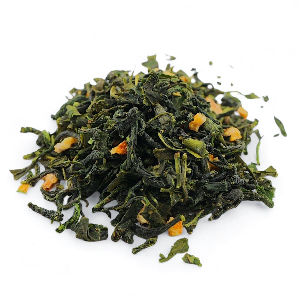 This tea begins with an organic Tamaryokucha — a curled-leaf Japanese green tea known for its smooth texture and gentle umami. Unlike the more commonly found sencha (a steamed Japanese green tea tha is rolled into straight needles), Tamaryokucha is pan-finished rather than needle-rolled, giving it a rounder, slightly nutty taste and buttery mouthfeel.