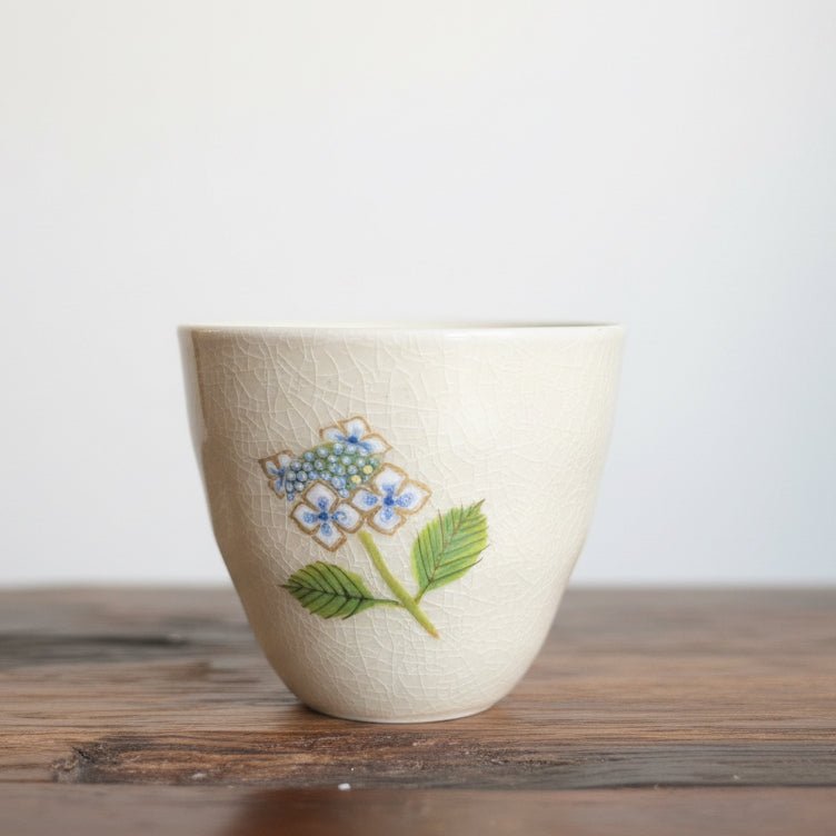 The surface is finished with a soft crackled glaze, serving as a quiet backdrop for handpainted flowers and leaves that recall the gentle, fleeting beauty of autumn in full bloom. The artwork is intricate and delicate, drawing you into a moment that feels both warm and ephemeral. Subtle gold accents are brushed in with care, adding a refined layer of elegance without overwhelming the design.