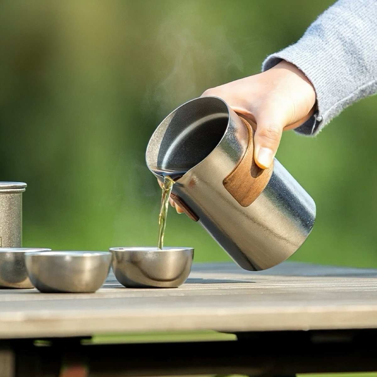 Featuring a sleek silver finish and a smooth, rounded design, this travel tea set includes a tea infuser, a pitcher, and four titanium teacups that fit perfectly inside. Ideal for tea lovers on the go, this set also comes with a stylish carry case. Its stunning icy shades add a dazzling visual effect, making it both elegant and convenient.