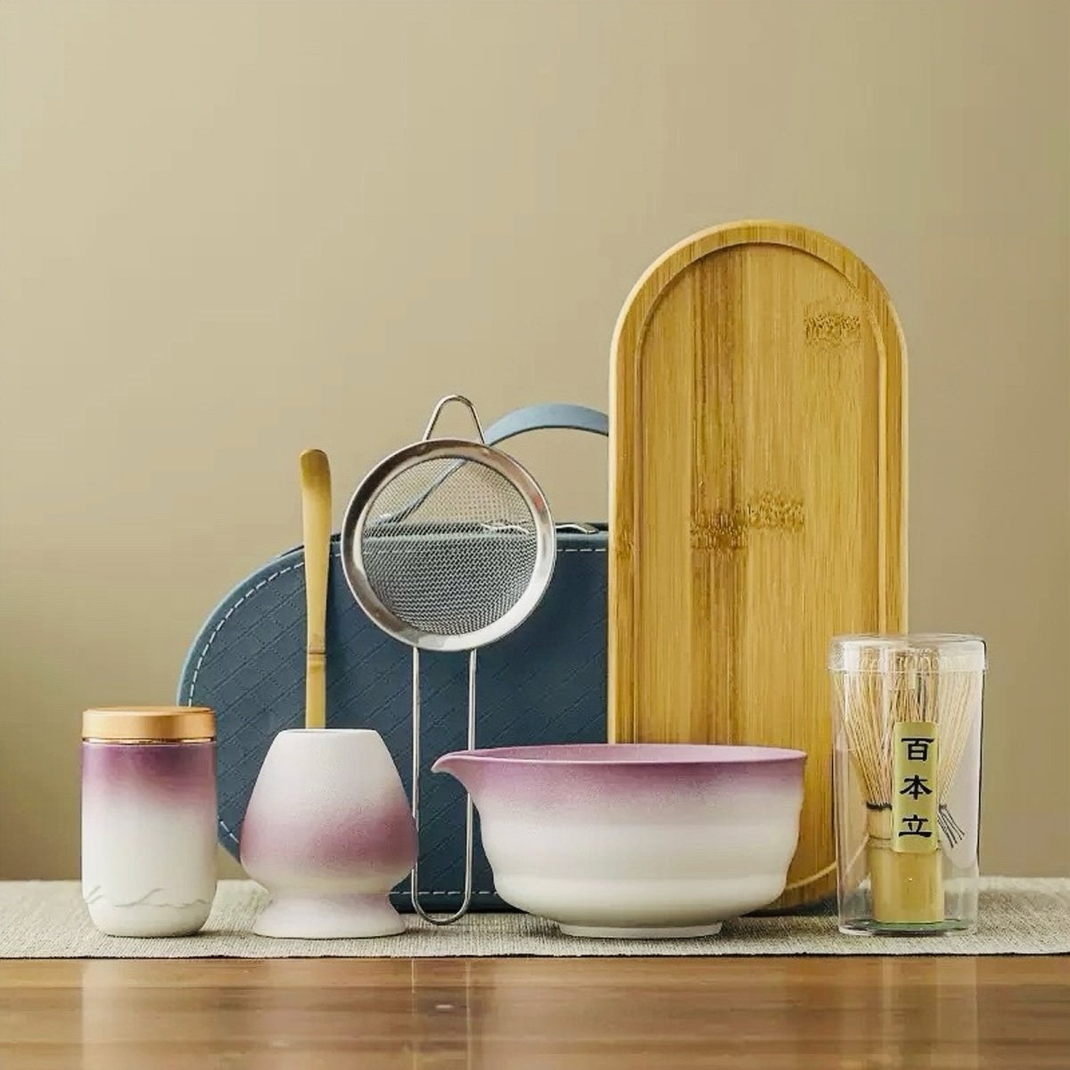 A complete matcha travel set including whisk, whisk stand, scoop, strainer, tea canister, bowl, bamboo tray, and travel case — thoughtfully matched in color and form to create a harmonious brewing experience at home or on the go.