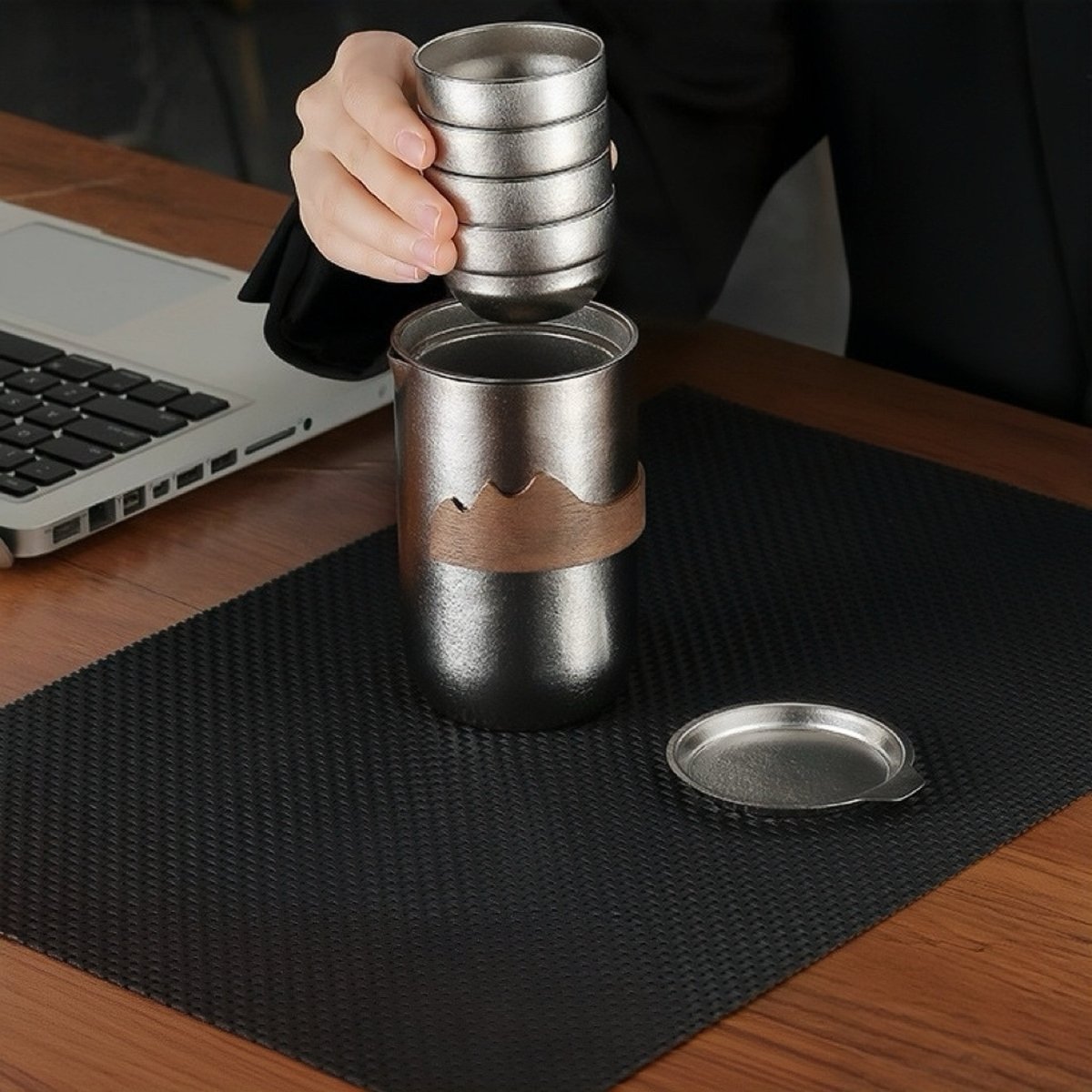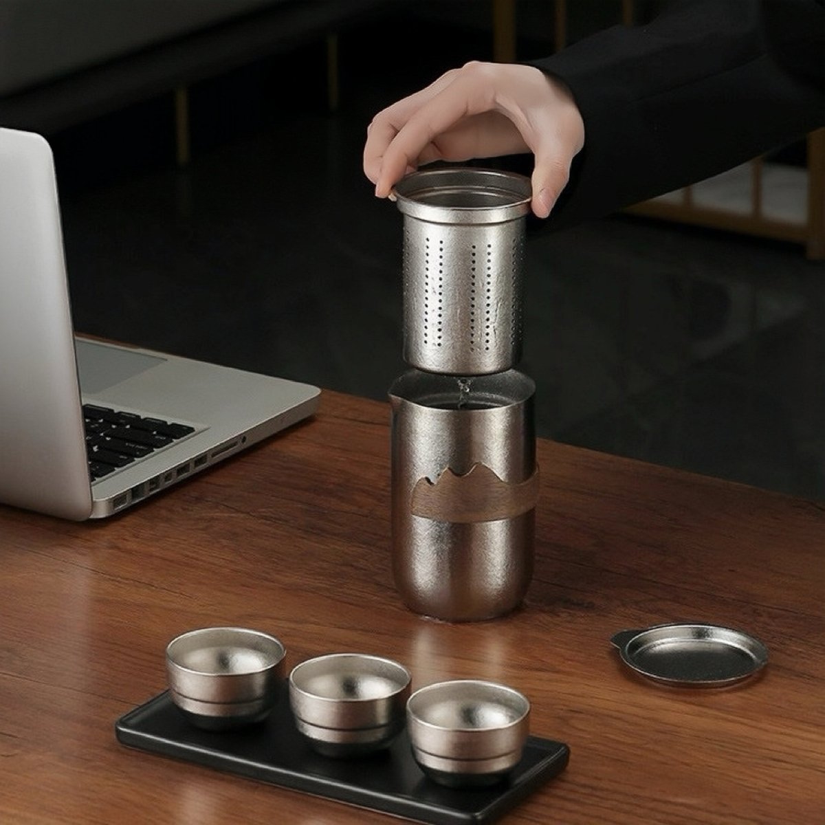 Featuring a sleek silver finish and a smooth, rounded design, this travel tea set includes a tea infuser, a pitcher, and four titanium teacups that fit perfectly inside. Ideal for tea lovers on the go, this set also comes with a stylish carry case. Its stunning icy shades add a dazzling visual effect, making it both elegant and convenient.